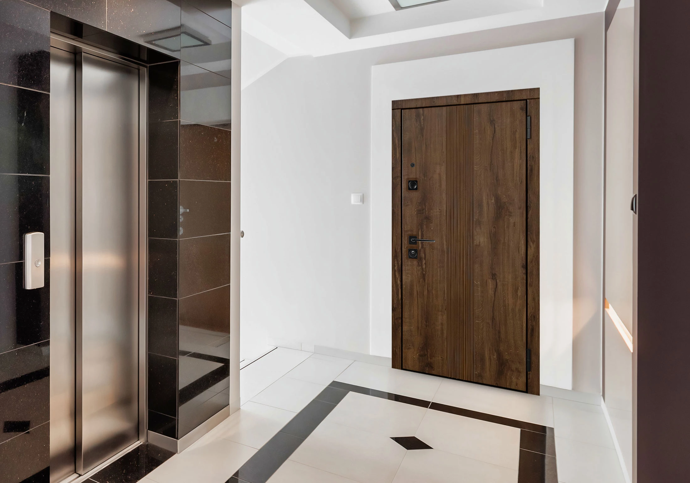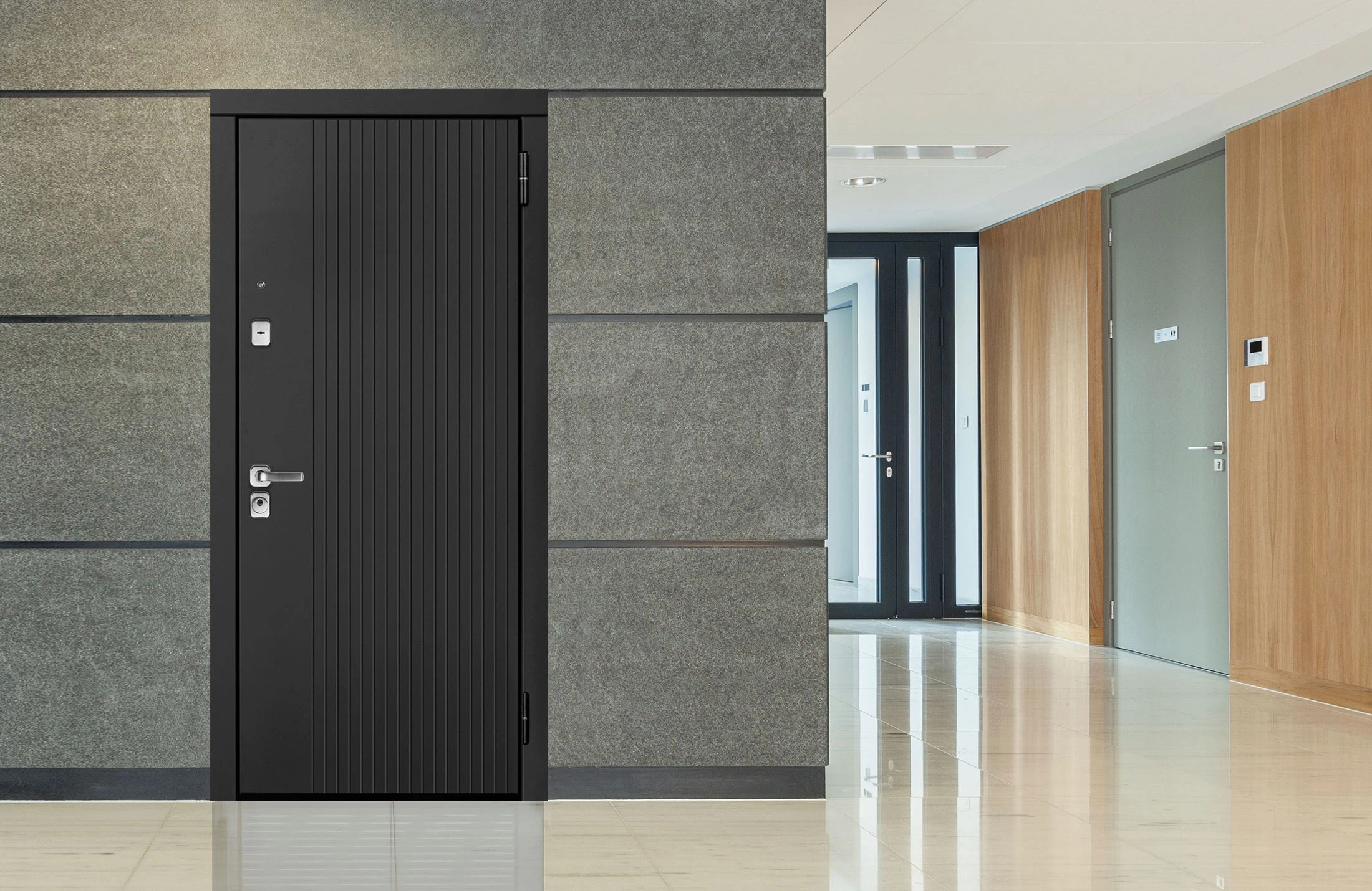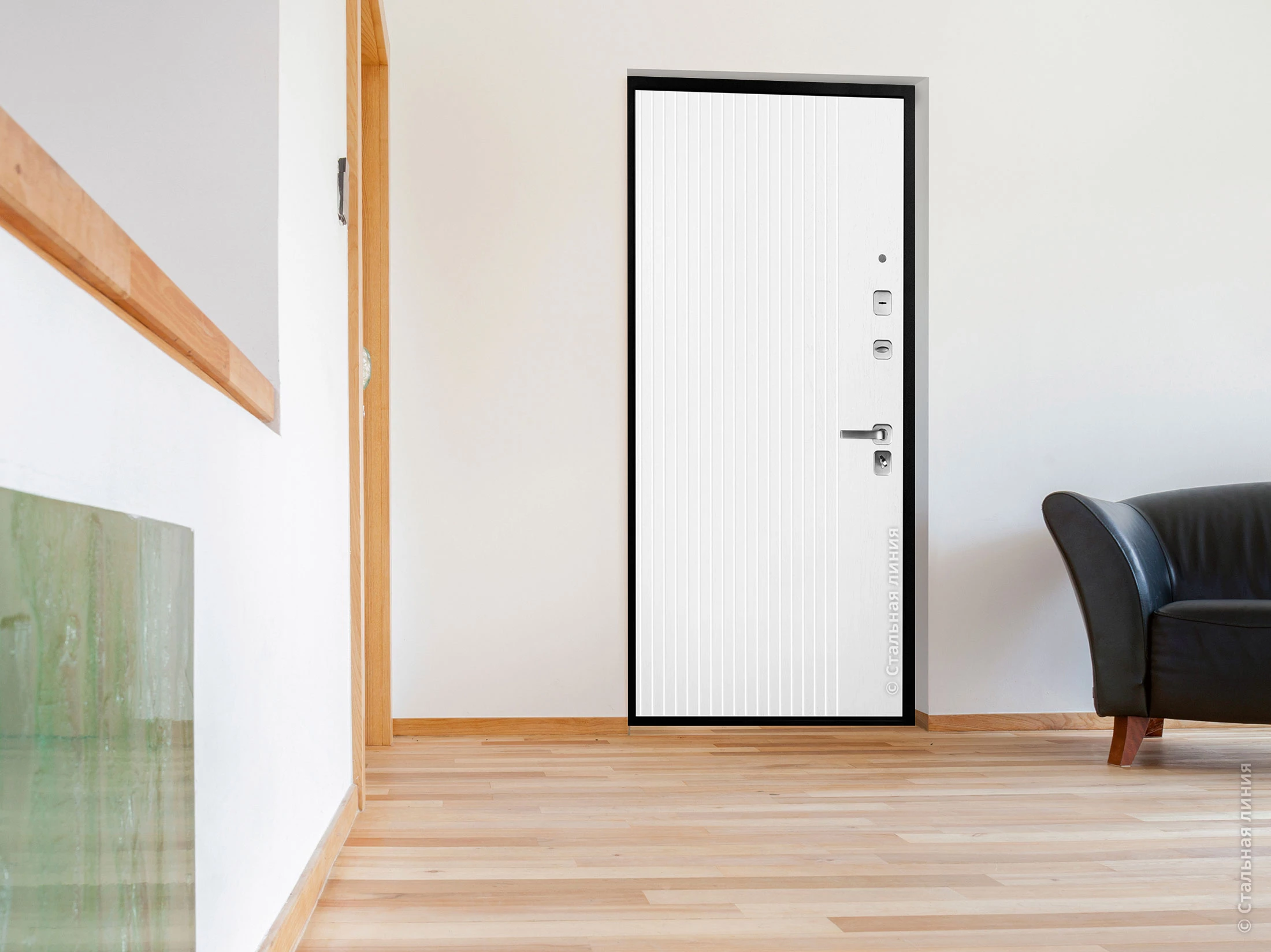 Дверь Line - модель 80-й серии в покрытии "Steeltex" снаружи и "Экошпон Premium" внутри. Светлая внутренняя сторона и четкие прямые линии в рисунке двери отлично сделают визуального простора вашей прихожей.