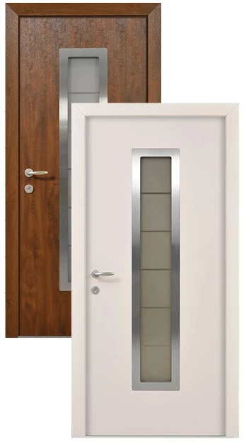 Отличительной особенностью модели «Север-70» является нетипичое исполнение для входной системы. По центру полотна здесь установлен оригинальный 3-камерный стеклопакет, что в сочетании с благородной расцветкой под ценную древесину обеспечивает двери уникальный и неповторимый дизайн.