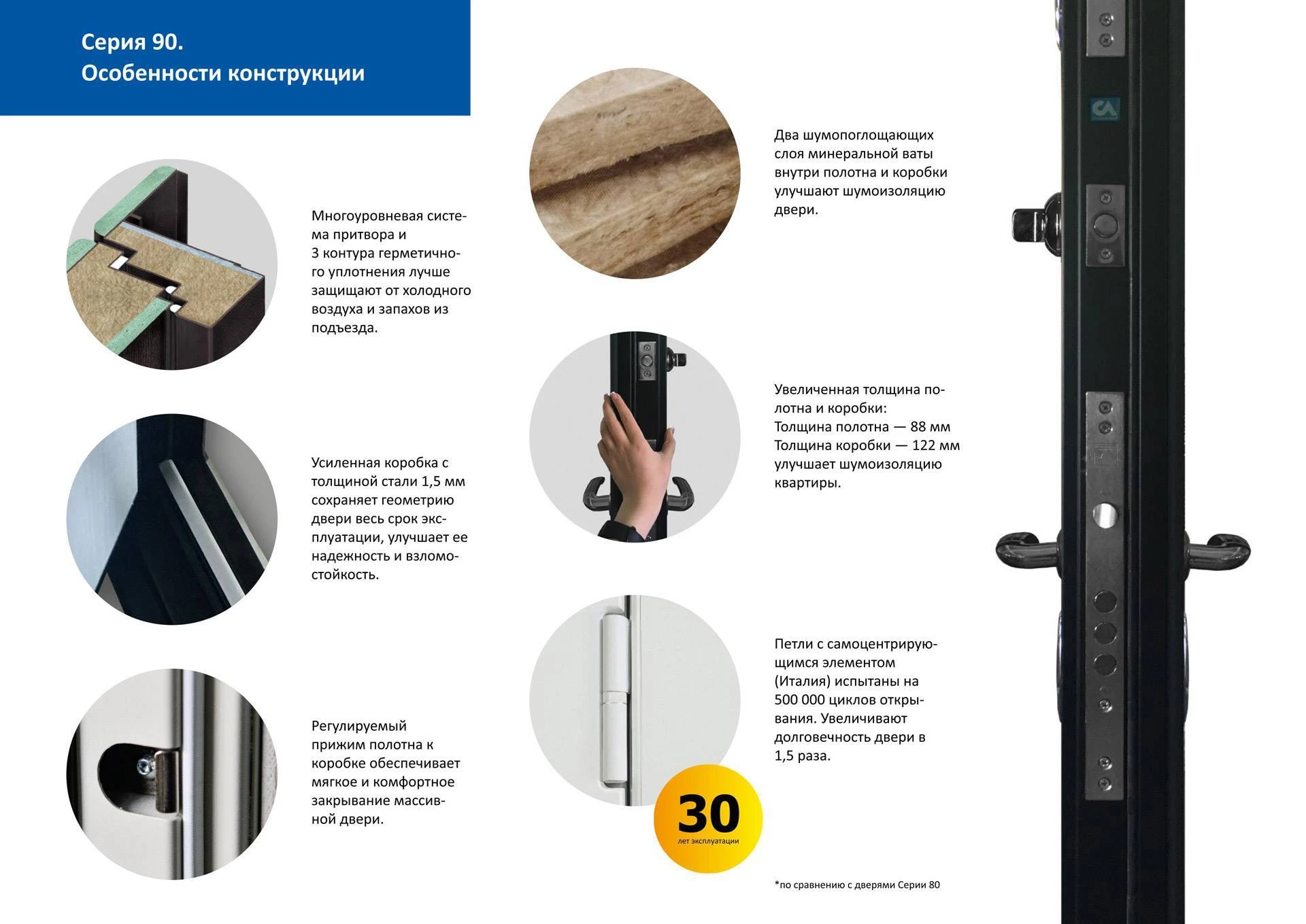 Двери новой серии 90 получили еще более мощную и усиленную коробку, позволяющую двери сохранять свои качества даже при сверхчастой эксплуатации. Каждая деталь выверена до десятых долей миллиметра, чтобы геометрия двери была идеальной и не нарушалась со временем.