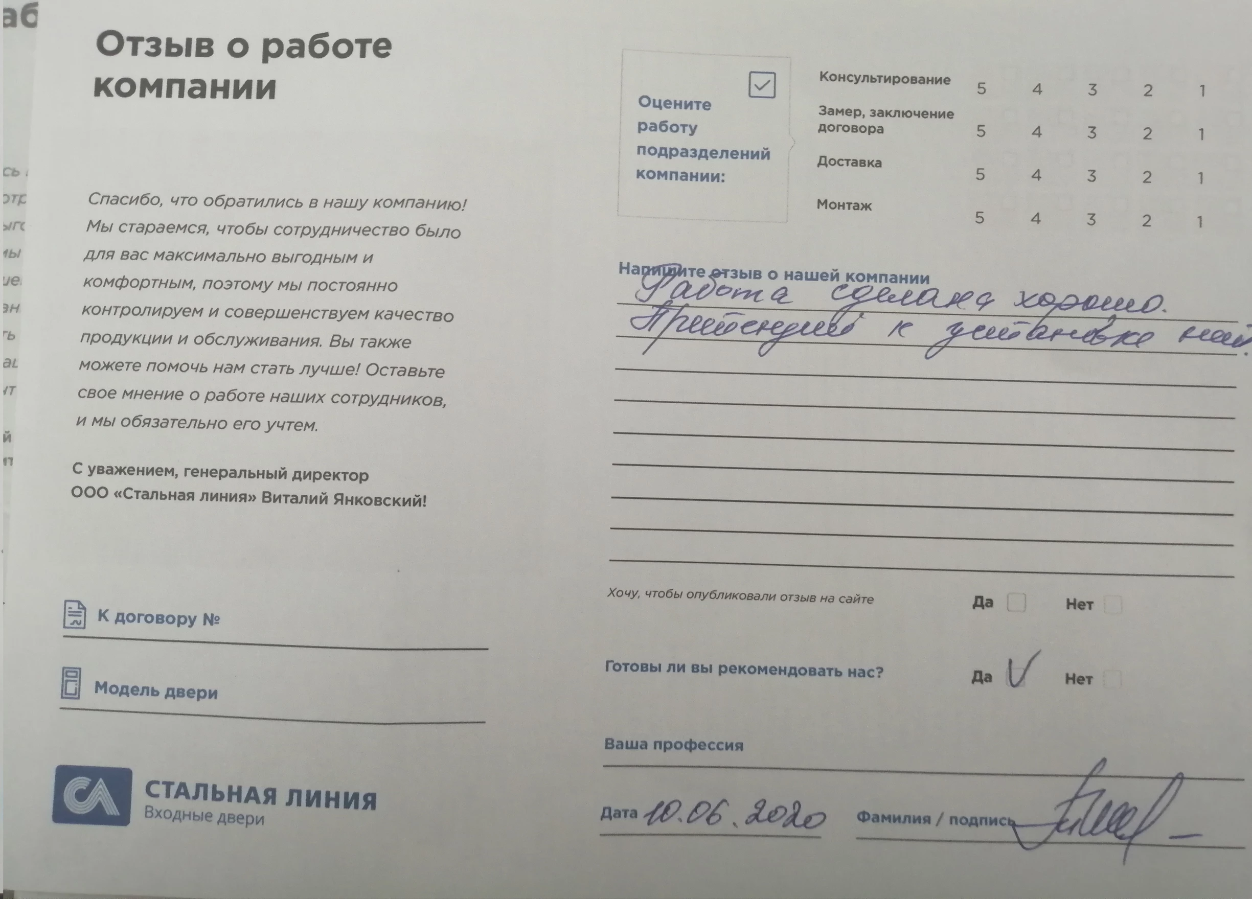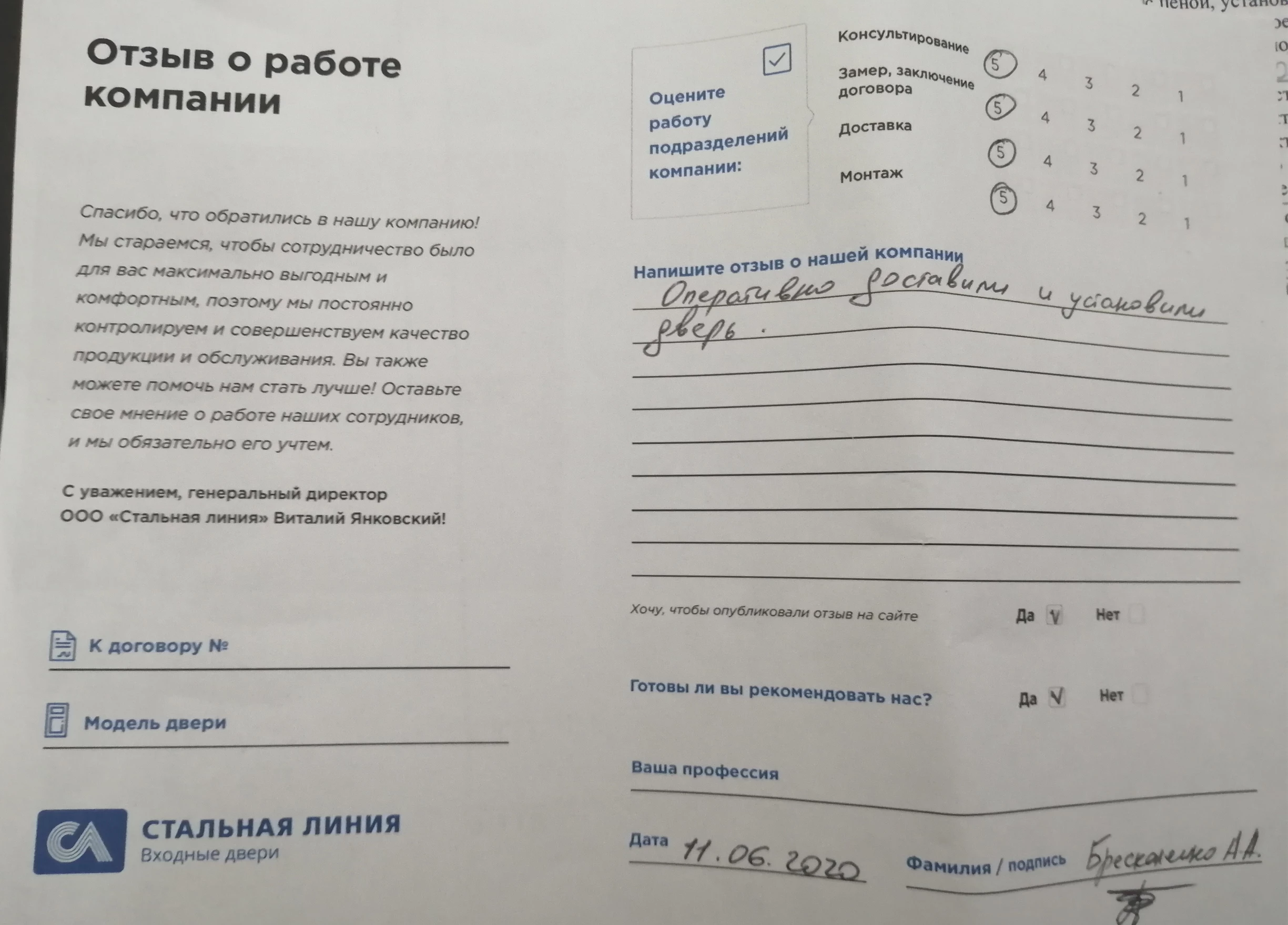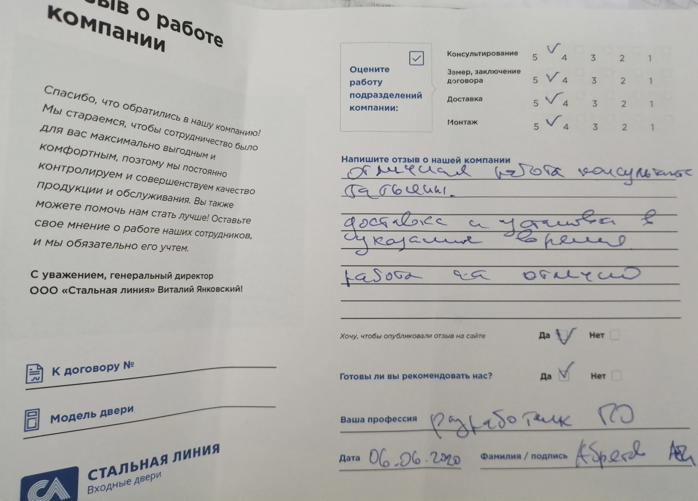 Спасибо за шикарную дверь. За хорошее обслуживание. Ребятам спасибо отдельное за установку.