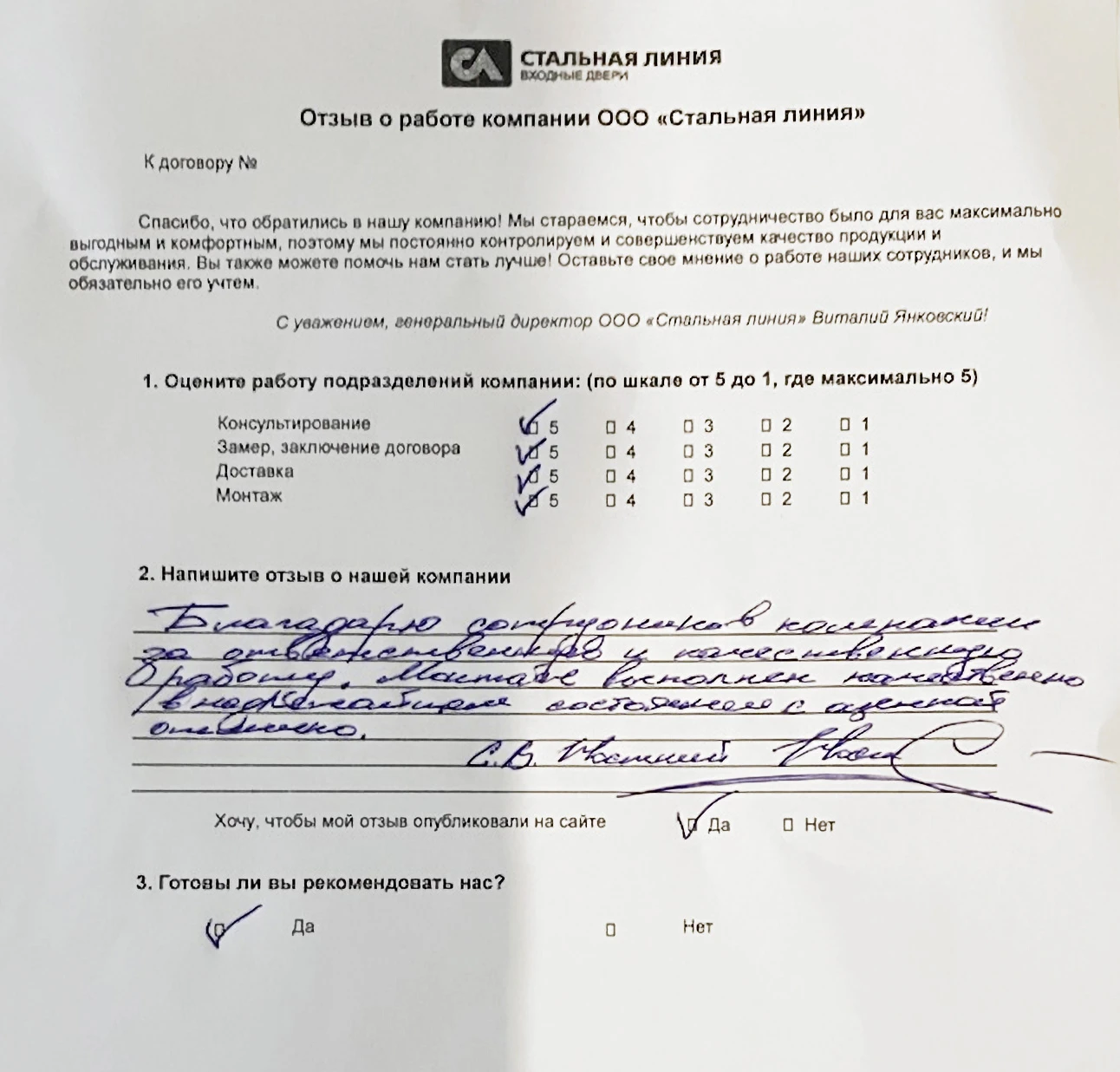 Выражаю большую благодарность компании "Стальная линия" за качественную продукцию, отличный сервис. Нельзя не отметить качество работы сборщиков - Дмитрия и Алексея. Выполнена работа быстро, аккуратно.